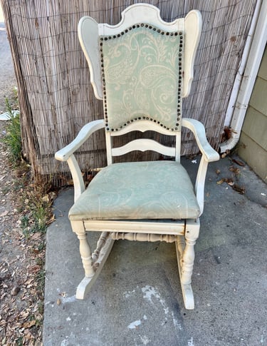 This wingback oak rocking chair might not look like much right now, but beneath the old paint and worn fabric is a solid oak beauty with so much life left in her. I’m currently stripping it back to its natural wood and prepping it for a full makeover, and it’s available for your custom colors and fabric. Once restored, it’ll last for years and would look adorable in a kid’s room, a classroom, or even out on the front porch. If you’re interested, reach out!