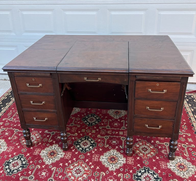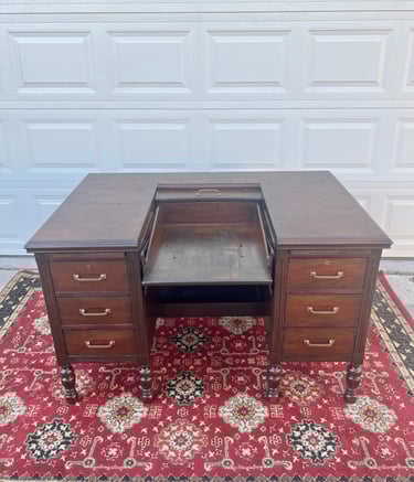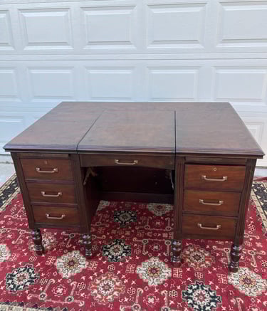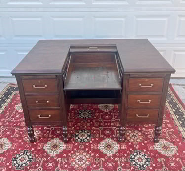 Solid wood vintage desk used in the 1940s with six drawers and a hideaway top that lifts and slides back to reveal the old typewriter compartment. Originally belonged to prominent San Diego attorney, Ralph Waverly Wallace.
