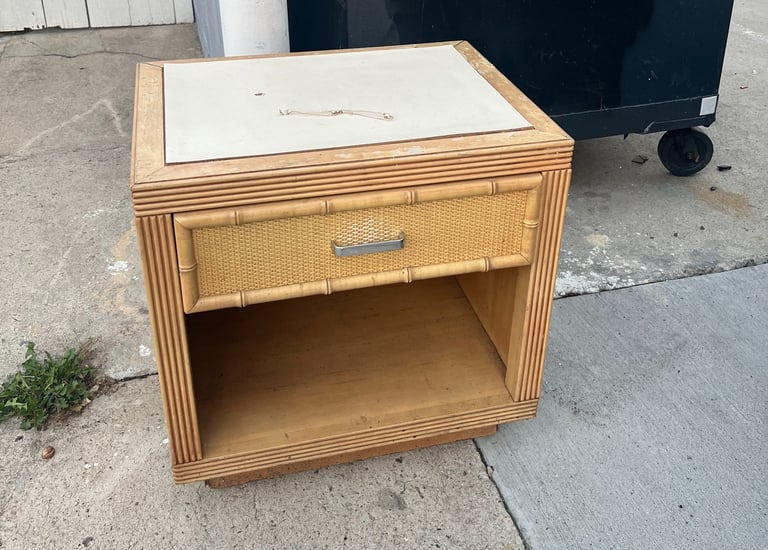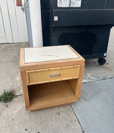 This little cutie has good bones. With a solid wood frame and base, the top and sides are particle board and will need some minor repair. Drawer slides smoothly. It would look nice with painted and stained elements, with the drawer left rattan.